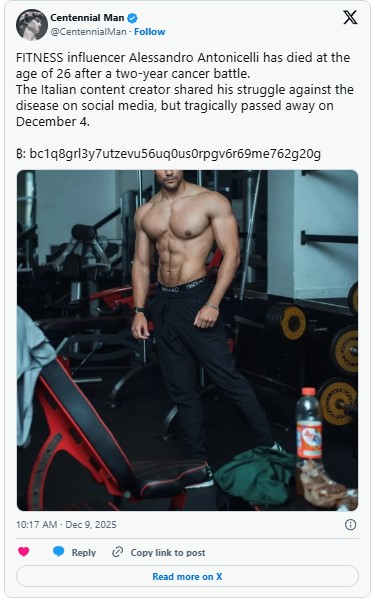 Fitness influencer Alessandro Antonicelli passed away earlier this month after a long battle with health issues, including hospitalization in the final months of his life.