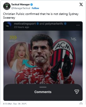 The rumors began circulating on December 25 after Italian gossip outlet Gazzetta reported an unverified Instagram post from Bomber’s DNA, claiming a romance between Pulisic and Sweeney.