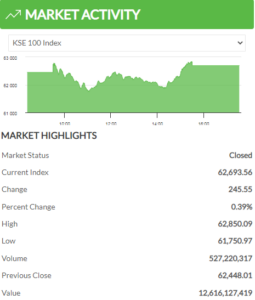 The Pakistan Stock Exchange (PSX) benchmark KSE-100 Index on Thursday recovered to positive mode when it added 245 points. The intraday trading gained 0.39% of value concluded at 62,693 points.
