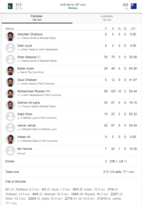 Mitchell Starc got rid of Agha Salman after the latter had scored 53 runs in 67 balls by hitting 8 fours. All rounder hasan Ali quickly came to crease, faced five balls and back to dressing room for (0) leaving Pakistan 227/9.