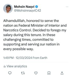 Taking to X, formerly known as twitter, newly sworn-in Interior Minister Mohsin Naqvi announced not to  take his salary in view of the challenging times faced by the country.