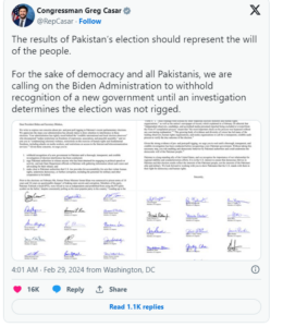 The lawmakers, belonging to Biden’s Democrats, in a joint letter, voiced concerns about pre- and post-poll rigging in recent parliamentary elections held in Pakistan. The lawmakers have called for a fair and credible investigation before recognising a new Pakistani government. They were of the view that elections were rigged.