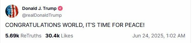 In another post, Trump wrote, “Congratulations, world—it’s time for peace.”