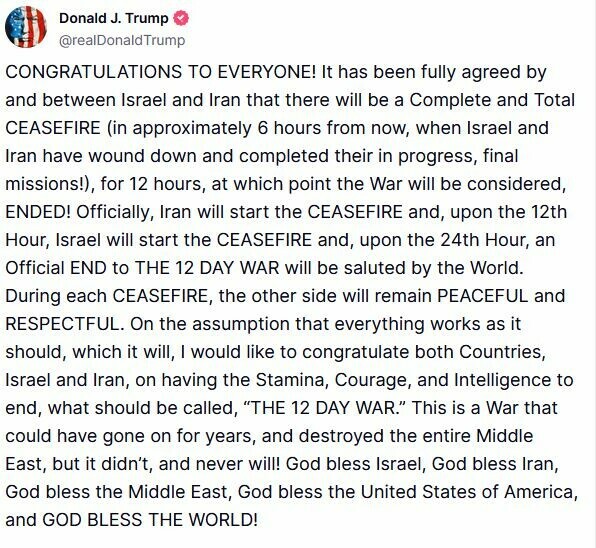 President Trump, in a statement released on his social media platform Truth Social, wrote, “Congratulations to everyone, it has been fully agreed by and between Israel and Iran that there will be a complete and total ceasefire.”