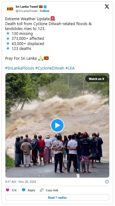 Severe rainfall and flooding caused by Cyclone Ditwah in Sri Lanka have so far claimed the lives of 123 people, with more than 130 reported missing.
