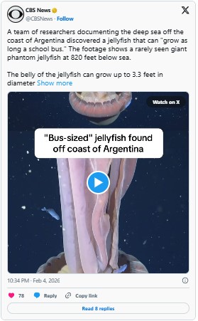 Marine scientists have captured rare, high-definition footage of a Giant Phantom Jellyfish (Stygiomedusa gigantea) in the deep waters off Argentina’s coast. The colossal jellyfish, estimated to be the size of a school bus, was observed by a Remotely Operated Vehicle (ROV) at a depth of several thousand feet. This sighting is especially significant, as the species has been recorded fewer than 150 times since its discovery in 1899.