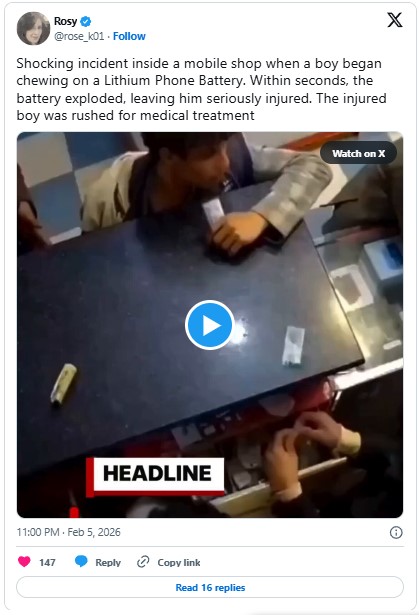 A shocking incident at a mobile phone shop has gone viral after CCTV footage captured a young boy sustaining serious injuries when a lithium battery exploded inside his mouth. The video shows the child standing near the service counter before unexpectedly biting into the battery, with the reason for his action still unknown.
