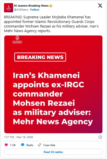 According to the report, “Supreme Leader Mojtaba Khamenei has appointed former Islamic Revolutionary Guards Corps commander Mohsen Rezaei as his military adviser, Iran’s Mehr News Agency reports.” Rezaei previously served at the helm of the IRGC and has remained a prominent figure in Iranian politics and security circles.
