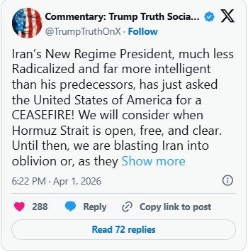 “We will consider when Hormuz Strait is open, free, and clear. Until then, we are blasting Iran into oblivion,” he said.