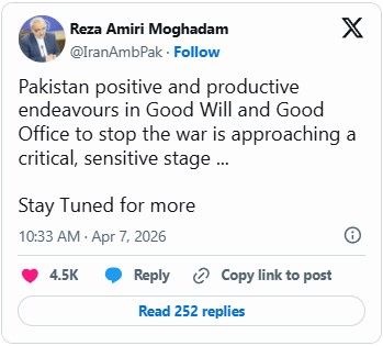 Iran’s ambassador to Pakistan, Dr. Reza Amiri Moghadam, has stated that Islamabad’s diplomatic efforts to halt the ongoing conflict involving Iran have entered a “critical” and sensitive phase.